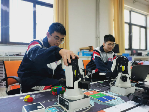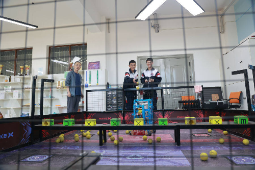 指导老师和参赛选手一起练习MakeX机器人挑战赛项目( 张赛 摄) 2022年,ENJOYAI赛项在通渭一中正式设立,在当年的比赛中,就获得了三等奖的成绩。今年,为迎接本次比赛,通渭一中人工智能实训室从组织、培训、后勤等各方面为学生提供了全面的保障和支持,在赛前一个月的训练期间,参赛选手每天进行程序编写、修改、调试,把在赛场上能够遇到的问题都一一找出,并各个击破。在日复一日的不懈努力之后,他们对各个程序的端口、序号都了然于胸,这为比赛取得优异成绩奠定了基础。 “同学们通过一个假期认真地训练,在这次大赛中和全国60多个队伍进行了激烈地竞争,终于夺得了冠军,我们感到同学们的付出是值得的。”常克义说,对于获得诸多荣誉的通渭一中人工智能团队来说,又一次夺得世界级大赛的冠军不是偶然,更是必然,每一次比赛,他们都全心身投入、百分百付出。