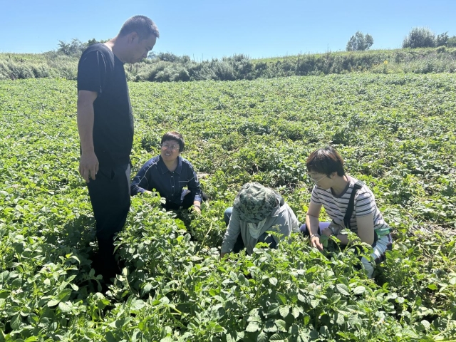 近日,渭源县马铃薯及小麦“三区”科技人才服务团团长牟丽明带领团队成员,赴会川镇开展科技服务活动。此次活动聚焦马铃薯疫病防控,同时为春小麦新品种(西优麦1号、定麦2号、定丰19号等)生产对比示范田的收获工作提供技术指导。 马铃薯是会川镇的主要粮食作物,种植规模大。马铃薯晚疫病作为一种暴发性、流行性、毁灭性的气传病害,其病菌在一个生长季内可多次侵染。若田间湿度较大,仅需4-7天就能完成一次侵染循环;而当前雨露充足、高温高湿的气候条件,极易加速病害从点到面扩散蔓延,短期内可能暴发流行,直接导致马铃薯减产。 服务团深入棉柳坪村、本庙村、鹿鸣村,对田间马铃薯长势及病害发生情况进行全面巡查。当前正值晚熟马铃薯增产关键期,多数田块植株长势良好,但部分马铃薯叶片已出现水渍状褪绿小斑,后逐渐扩大为褐色坏死病斑,边缘伴有浅绿色晕环,初步判定为晚疫病初期症状。为此,服务团紧急动员村社干部、农户及专业化防治组织,强调要以“预防为主、防控结合”为原则,积极防控马铃薯晚疫病、早疫病,遏制病害蔓延。同时提出综合防控建议:一是选用抗病品种,淘汰带病种薯,从源头降低病害发生风险;二是加强田间管理,及时清除病株病叶,通过合理密植和培土改善通风透光条件,降低田间湿度;三是在病害初发期,选用高效低毒杀菌剂开展药剂喷雾防控,且需密切关注天气变化,在连续阴雨或高湿度天气前提前预防,严格遵循农技部门指导科学用药,避免抗药性产生。此外,还提醒农户加强对马铃薯病毒病、黑痣病等常见病害的监测,发现异常及时向当地农技人员报告。专家们通过“田间诊断+现场指导”的方式,为渭源县马铃薯病害防控开出“精准处方”,助力农户将病害消灭在萌芽状态,保障马铃薯丰产丰收。