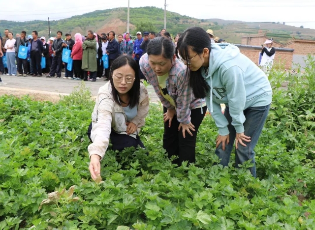 近日,通渭县科技“组团式”技术帮扶暨科技特派员志愿服务团在义岗镇明星村蔬菜种植基地开展集中服务活动。来自全镇的100余名蔬菜、中药材种植户参加培训。邀请甘肃省现代农业产业技术体系中药材产业体系首席专家、教授陈垣,省“三区”科技人才、甘肃农业大学教授肖雪梅进行现场培训指导。